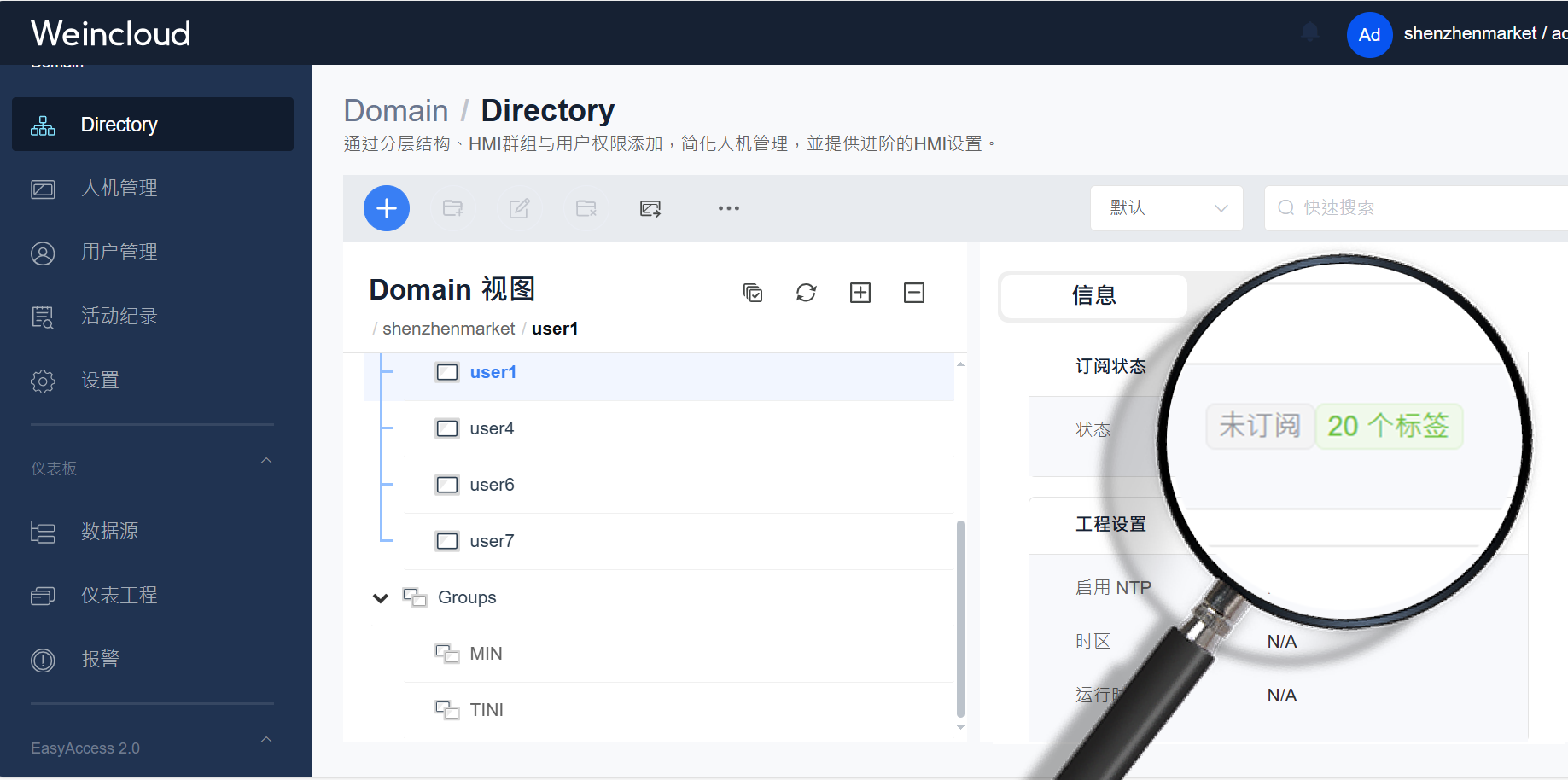 Directory 采用資料夾分層結(jié)構(gòu),在 Domain 下可依照需求使用資料夾來分類,以及將資料夾作為Subdomain,指定特定用戶來管理 Subdomain 下的 HMI 及用戶。