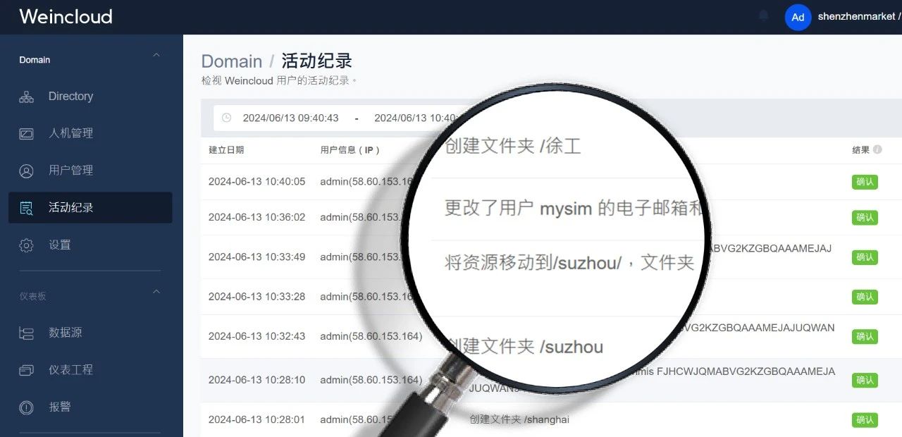 除了靈活的權(quán)限管理,Weincloud 還提供詳細的活動記錄,幫助管理者采集用戶行為,包括登錄記錄、密碼修改、權(quán)限更改…等。這有助于提升系統(tǒng)的安全性,憑借著完整的人員行為追蹤,確??焖僬业桨l(fā)生各種異常的原因。