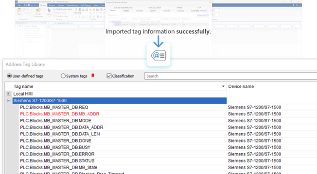 將PLC原廠軟體輸出的地址資訊檔案匯入EasyBuilder Pro,即可自動(dòng)完成設(shè)備地址列表的建立,大幅簡化將PLC地址整合至HMI的過程。