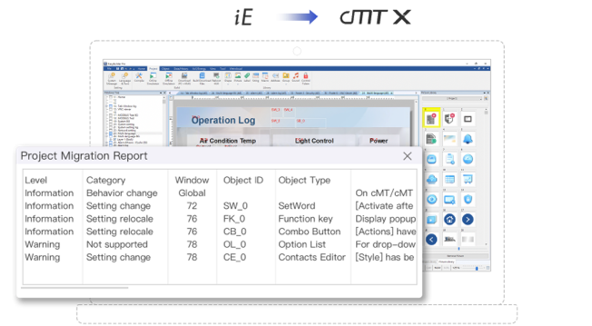 舊機(jī)升級(jí)只需修改HMI型號(hào),由EasyBuilder Pro自動(dòng)進(jìn)行大部分功能轉(zhuǎn)換,并提供升級(jí)報(bào)告及修改指引,用戶無須重新設(shè)計(jì)HMI畫面,實(shí)現(xiàn)無縫轉(zhuǎn)換。