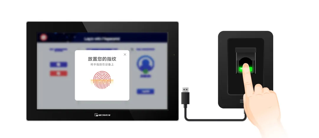 威綸通HMI通過USB連接指紋機(jī)(相關(guān)型號可咨詢威綸通工作人員),可進(jìn)行指紋身份驗(yàn)證。用戶只要將手指放在指紋機(jī)上,即可完成身份驗(yàn)證,并登錄人機(jī)系統(tǒng)。指紋識別驗(yàn)證依靠生物特性更難以被仿冒,其安全性更上一層樓。